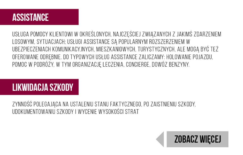 - Assistance: Zapewnia pomoc techniczną na drodze (np. holowanie, samochód zastępczy) po awarii lub wypadku.